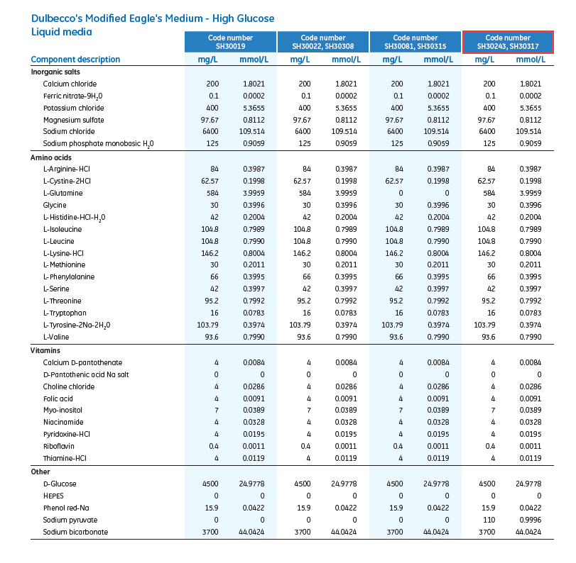 HyClone DMEM 原材料的成分均通过了严格的质量控制测试筛选,以确保批次间的一致性。DMEM 液体培养基产品已使用纯化水进行了水化,并经过了无菌过滤。